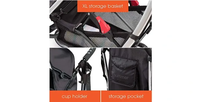 The babysitting chair and stroller by Summer Infant include various storage spaces like organization trays, snack and drink holders, toy bars, hoods, and many more, providing a secure space to keep everything safe and comfortable on this four-position recline.