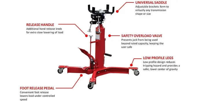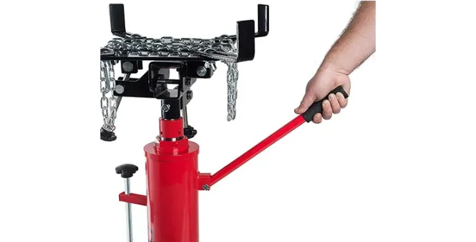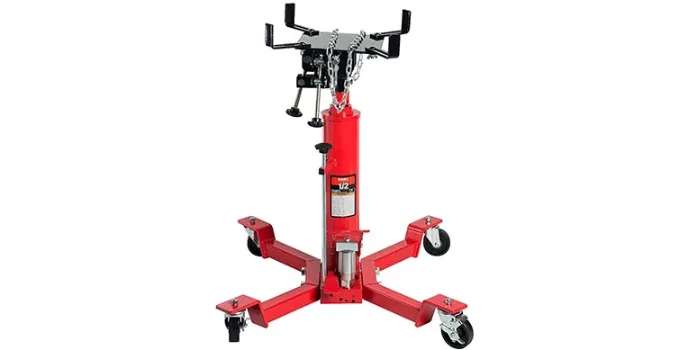 Sunex 7793B jack has 4 wide base legs, along with the swivel caster and polyurethane tread wheels, providing tons of stability and easy navigation under heavy load. Moreover, its chain tie-downs secures transmission to a saddle; that handle helps move the jack and get it in the right position, which makes it ideal for most vehicles.