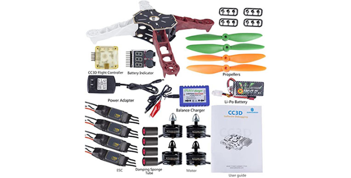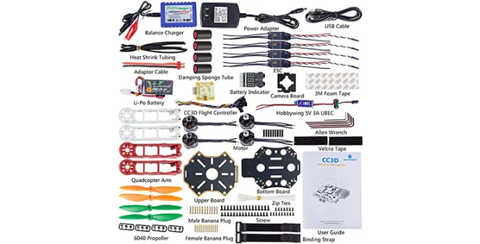 As the best drones for beginners, you can get a detailed manual with pictures along with lots of intelligent accessories, including two batteries, four spare props, three USB battery chargers, and the four propellers with the SunFounder 250 Drone.
