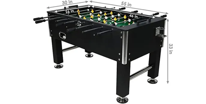 The decor table provides a large playing field in an overall dimension of 55 inches long and 30 inches wide with solid construction and a PVC laminated MDF rod, a good chrome-plated Steel where the players are abs plastic and folding drink holders.