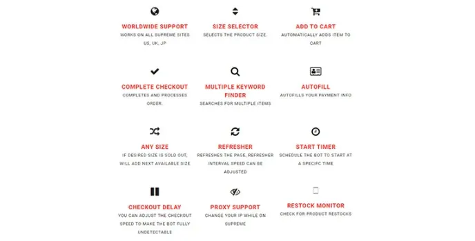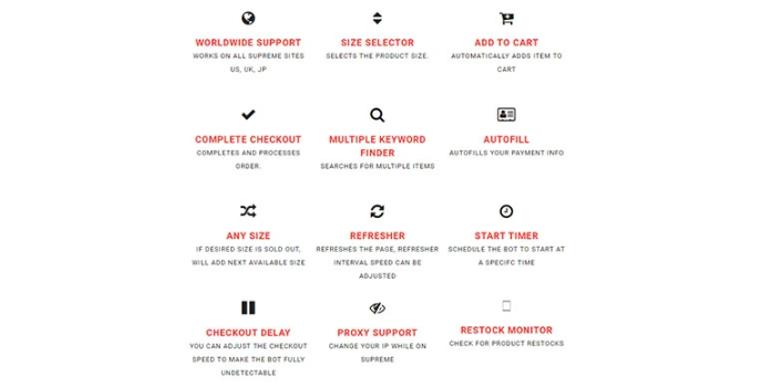 Supercop Supreme Shopify Bot has a big list of features to benefit customers in the UK and US. One of the bot's attractive features is Size selector functionality to help people choose their desired size according to the size chart. Add to cart is another feature that lets users move multiple items to the cart automatically to shop later.