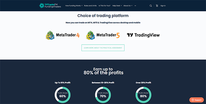 T4TCapitalFM is one of the few platforms where you must pass the practical assessments to be eligible for funds and open a trading account with higher limits. With this platform, you can earn up to 80% of your profit share. The loss margin is also very low like OneUp Trader and The5ers. Apart from all these features, before opting for T4TCapitalFM, you should always research more about trading and how risky it is.
