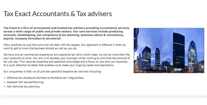 Focusing on the side of other phenomenal services of TaxExact, you can find here the amazement of Statutory Accounts, Self Assessment Tax Returns, Payroll & CIS Returns. Inheritance Tax Planning, Company Secretarial, Book-Keeping, Tax Investigations, and more.