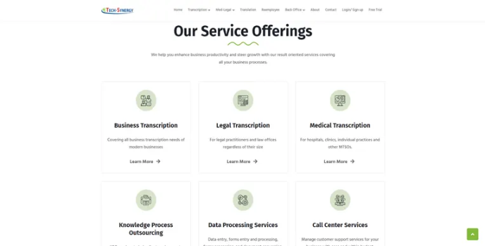 The best alternatives for Tech-Synergy are Transcription Outsourcing and Take Note Services. They provide transcription and proofreading services for medical, legal, law enforcement, and business. They have a competent team that works hard to deliver the greatest quality to their clients.