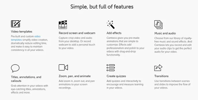With its simple recording toolbar, Camtasia offers solutions for making and editing videos quickly. The feature of annotations is also provided, which is quite useful for making videos easy to follow and watch. In addition to this, Camtasia provides tons of effects as compared to Ease Us and Quicktime. Ten different kinds of video effects are available for one to use; border, clip speed, colour adjustment, colour tint, colourize, device frame, drop shadow, glow, interactive hotspot and remove colour.
