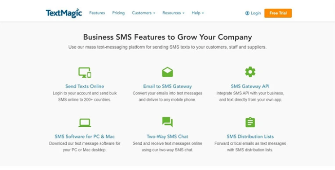 TextMagic allows you to send texts online to over 200+ countries, helps convert emails to text messages and send to any phone, an integrated SMS gateway API for businesses, Softwares for both Windows and Mac, allows two way SMS chats to send and receive texts, and also allows you to forward critical emails as text messages with SMS distribution lists. They have over 100,000 happy users since 2001.