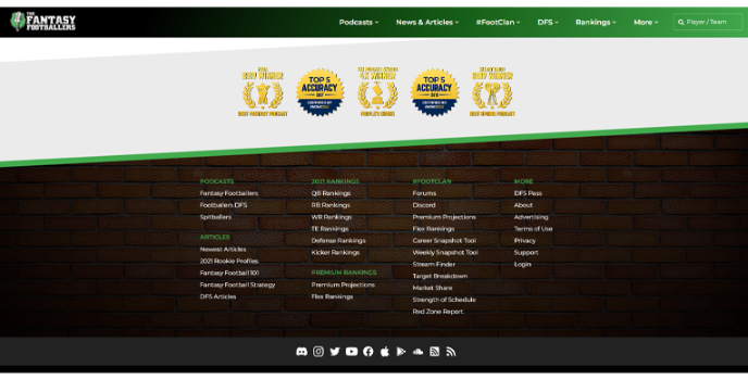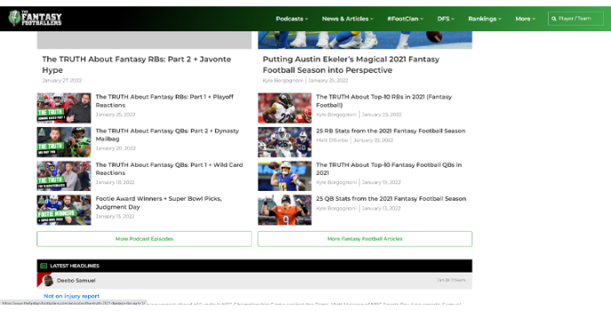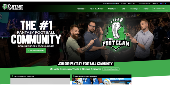 The shows offered by Fantasy Footballers are accessible on several podcast platforms, including Apple Podcasts, Google Podcasts, Spotify, Stitcher, Tunein, and Soundcloud. Each episode can also be viewed on YouTube. You can also keep up with the show on social media channels like Twitter, Instagram, and Facebook. Die-hard fans of this best fantasy football draft software may be found in the #FootClan, a close-knit fantasy community available at JoinTheFoot.com.