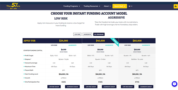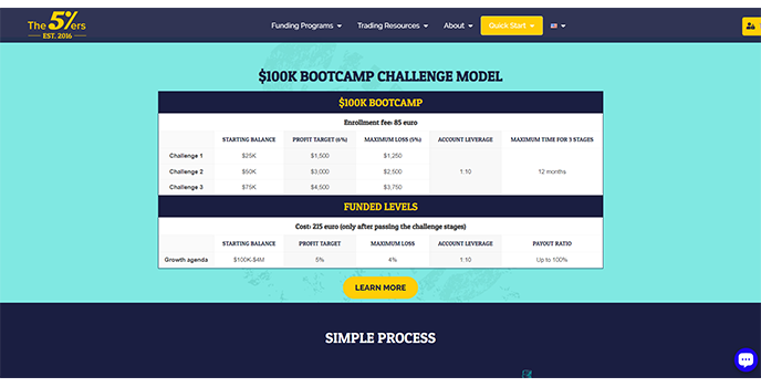 The5ers was started to provide a platform for traders to start trading accounts. With this online trading platform, you can learn how to make better trading strategies. It comes with the 100K Bootcamp program, a low-priced program that allows you to look for consistency and profitability. You can also create a demo account where you will get 3 phases of the challenge. The5ers comes with a low commission program and no hidden cost. You will also get profit targets, and there are no hidden costs available on this platform.