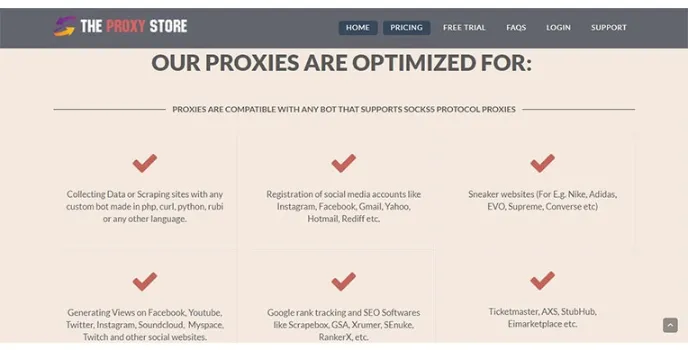 Theproxystore's key benefits are its support, quick download, and free traffic. You can use it to collect data from unique targets without wasting too much money on it.