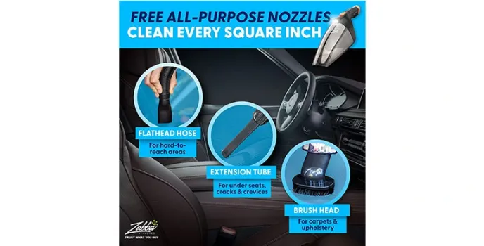 The Thisworx portable vacuum has three all-purpose nozzles: a flathead hose, an extension tube, and a brush head, along with a carry bag for easy storage for collecting dirt, dust, and other messes.
