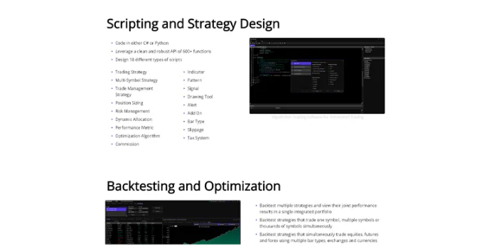 You can either choose to code in Python or C# in Tickblaze. This options backtesting software allows you to leverage a powerful and clean API of more than 600 functions. Besides, there are 18 different scripts to design - trading strategy, trade management strategy, risk management, and others.