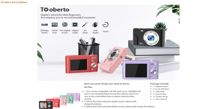 Toberto offers a sturdy and easy-to-operate digital camera for kids (with big buttons, so it's easy for kids to use). Kids can easily capture photos and videos without much assistance. Ideal for age 4 to 12 years old kids. With the specifically designed interface, kids can use the camera.