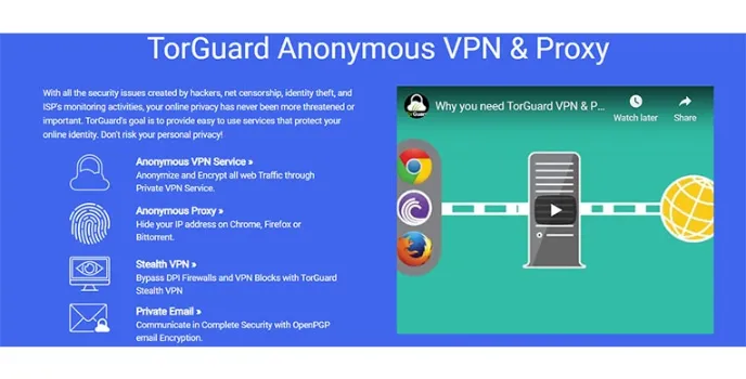 Torguard VPN is here to provide for the complete protection of your different activities on the internet. In the present times of ever-increasing issues of cyber threat like, net censorship, the security issues created by the hackers, identity threat and ISPβs monitoring activities, this VPN service has been created with the goal to provide for easy to use services that shall protect your online identity while securing your personal privacy in an ultimate manner.
