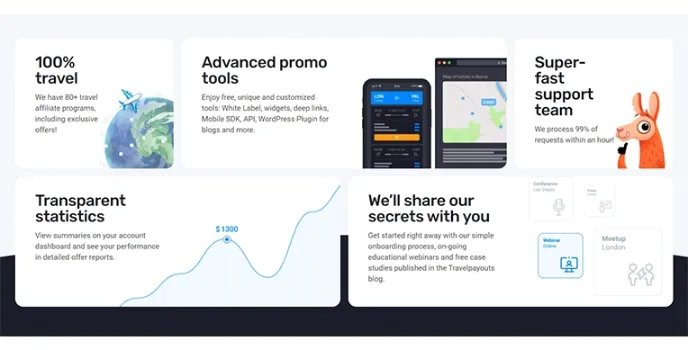 The TravelPayouts, Travel Affiliate Network, has a Super-fast support team that can process almost every request in almost just an hour. They provide Transparent statistics and allow you to view report summaries on your account dashboard that let you understand the performance in detail. They also allow you to publish your travel blogs or travel-related case studies in Travel Payouts blog. This Travel Payout CPA Network also permits easy withdrawal schemes.