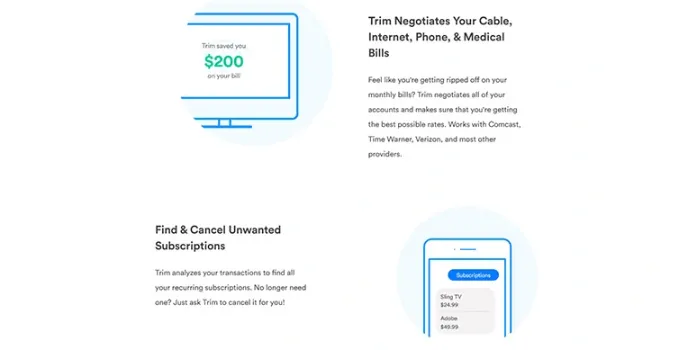 Trim is a bill negotiation service that provides automated bill negotiation services to customers. This service helps to save money on cable and internet bills. This service offers money-saving expert negotiation rates with the use of service providers. The savings calculator of this assistance analyzes the current balance of users.