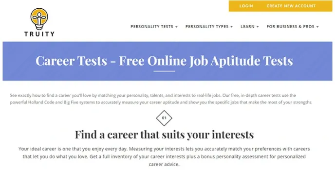 The Truity career guidance test website offers a vast opportunity for career choice. It provides free online job opportunity tests to help to match personality, talent, and interest to a real-life job. The free online job aptitude test acts as a powerful tool in measuring career aptitude and showing the assignments according to strengths. They have a Career Personality Profiler that helps measure interest and personality to find a job that matches the profile.