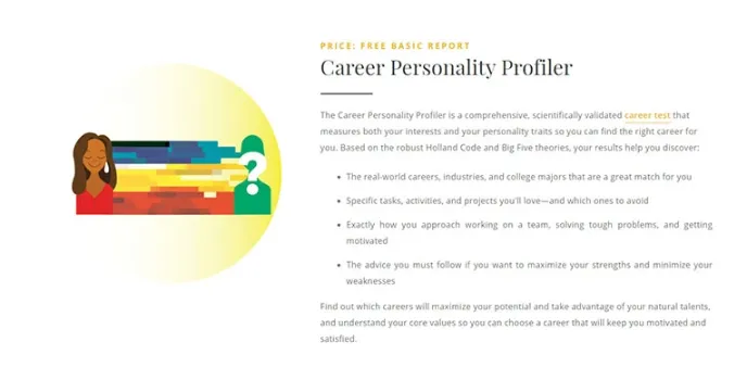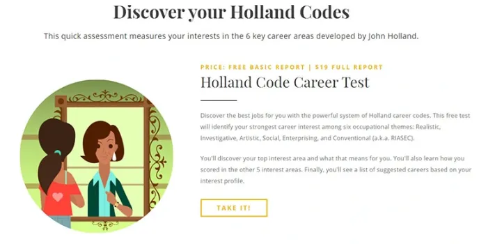 The Truity offers Holland Career testing procedures that provide the most effective system of Holland Career Codes. It will help find out strengths in Realistic, Investigative, Artistic, Social, Enterprising, Conventional. Users can have access to the free basic report, but if you want to have access to the full report, then you need to pay $19.