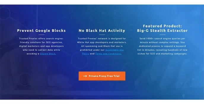 Trusted Proxies is an industry leader for Search & Digital Marketing professionals. You can depend on their services to safely and rapidly generate data and analytics for their clients and their research. Their server solutions are very fast, secure, and reliable.