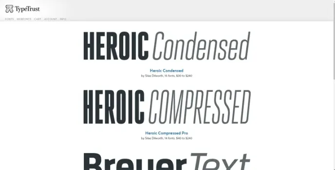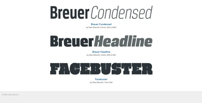 The best fonts available at TypeTrust are Breuer Condensed, Breuer Headline, Breuer Text, Cooter Pack, Everafter, and Diego. The Diego fonts are initially created as a custom version of the San Diego Padres broadcast graphics package. The Everafter fonts have no straight lines, and their vectors were uniquely designed for a soft and wobbly appearance. The other feature typefaces are Fatty, Sansarah, and Vandermark.