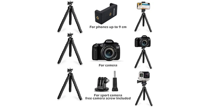 They can easily accommodate phones that are up to 3.54-inch width, and for cameras, they need an adapter screw thread. It has thicker metal legs with a flexible rubber coating, and it can easily handle rugged travel trips to daily home usage.