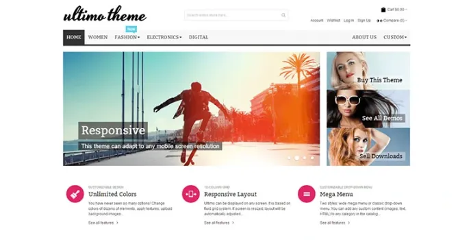 When it comes to features like slide bars, sub-themes, zooming with lightbox, or cloud zoom, Ultimo is more like SNS-Nova and Great Shop. It has the ability to arrange the grids in a fluid system into 12 columns, effectively making use of all the width available on the screen. There are customizable settings like patterns, backgrounds, and shadows, and integrations that can make the theme adaptable to any store.