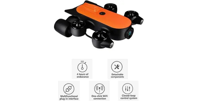 Locking the tilt angle can also advance, retreat, float, and dive. One can sail and hover at a specified depth to find and capture the picture you want precisely in the fixed depth mode. This marine drone is equipped with a GPS chip and displays the location promptly. It comes with a 4800mAh large-capacity lithium battery with 1-hour battery life. One needs to charge the submersible; other accessories do not need to be charged.
