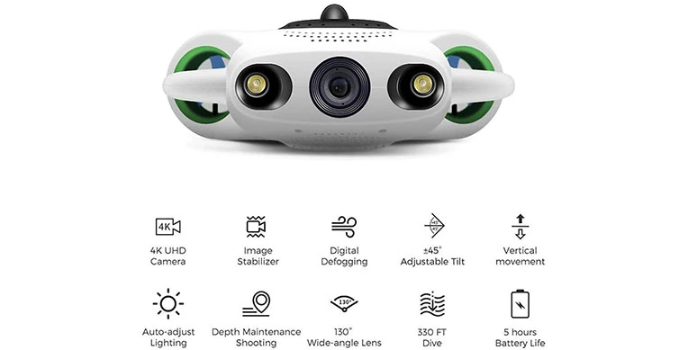 Stoge comes with a GPS chip for easy tracking of its locations and there will not be a problem of losing its position. It has a 96000 MAH long lasting battery for almost 5hours. It adjusts the light depending on the depth. When the light is weak, it automatically enhances to fill the light. When the light is dark, the light decreases automatically. Similar to DJG Underwater drone, This drone is used for recording underwater matches live, aquaculture, dive entertainment, island fishing, underwater archaeology, marine environmental protection, and also for some rescue missions. You can see all these features in the Nemo underwater drone and you can use this drone alternatively.