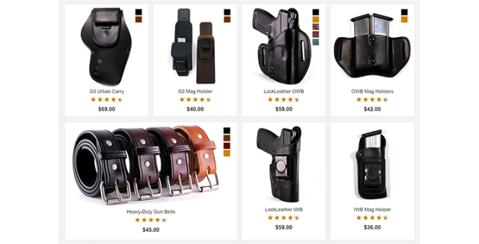 The company offers a variety of products, including gun holsters for cars, left-handed holsters, leather belts, totes, and lock leather hybrids. Its concealed gun holsters are available in various styles, including IWB (Inside the Waistband), OWB (Outside the Waistband), shoulder, and ankle.