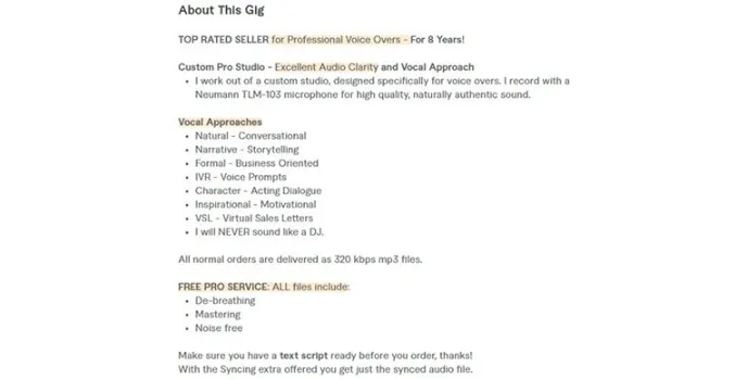 The USVoiceovermale top seller provides voice-overs in 2 days of delivery for 150 words of the script. The top seller offers a professional voice-over service for over eight years and possesses a custom pro studio. The Artist provides excellent audio narratives with a vocal approach, including Natural or Conversational, Narrative or Storytelling, Formal or Business Oriented, IVR or Voice Prompts, Character or Acting Dialogue Inspirational or Motivational voice-overs, and much more similar to best Search Engine Marketing Services by Fiverr.