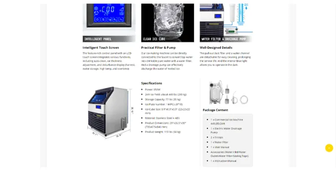 The model offers a 30-day money-back guarantee. If you are not satisfied with the product, you can return it and get a full refund. The Vevor commercial ice maker comes with a built-in LCD panel, including a Nano blue light. Moreover, it includes an automatic cleaning system and makes for quick and efficient cleaning.