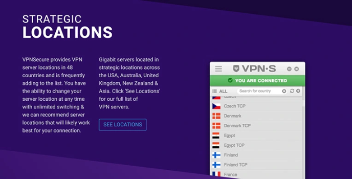 VPNSecure - VPN Server Locations in 48 Countries Including the USA and Australia.