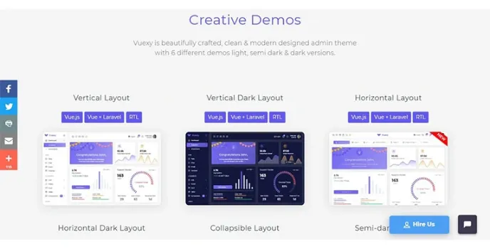This Vuexy app has options of unlimited color and a layout which is fully responsive. Likewise, it has three types of design: a dark horizontal layout, collapsible layout, and a semi-dark layout.