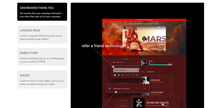 The viral referral marketing platform helps users create one-off campaigns and help create new referrals and revenue for your businesses through viral sharing and different social media actions.