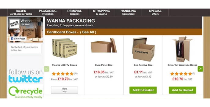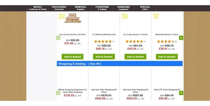 The website provides boxes, packaging protection, removal supplies, strapping and sealing, and handling equipment, all at special offers and deals.