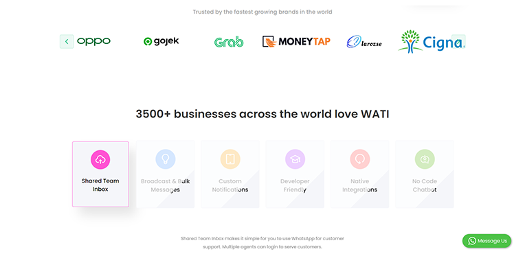 It provides various stores’ WhatsApp integration to improve customer satisfaction scores. You can browse popular integrations like Chat Button, Zapier, Shopify, Hubspot, Whatsapp Shop, Zoho CRM, and many more. With WATI, you can send timely information about offers & discounts and let the customers know the items that are back in stock. Thus through WATI, you can market your products and create more conversions in your business.