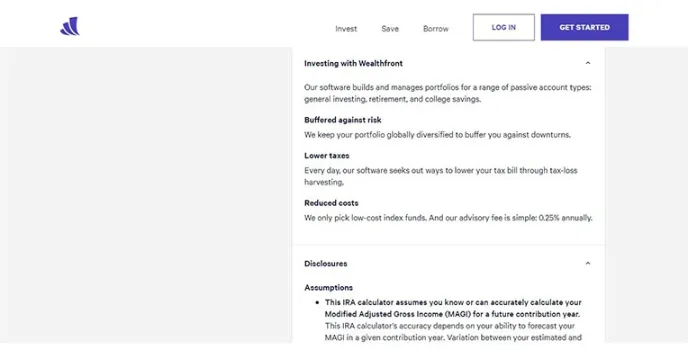 Wealthfront is one of the best IRA Accounts to keep your money in a safe place. With the help of Wealthfront, you can use the wealth front roth ira calculator to find out how much you need to save per month to live the life that you wanted after your retirement. The wealth front returns will tell you how much you are going to get back from the company once you are retired and your fixed deposits mature. Wealthfront gets started with savings for your future. It might look difficult for you at this moment to save money for the future, which is so far away from your present. But eventually, you will understand that you need to save it for the safekeeping of your future.