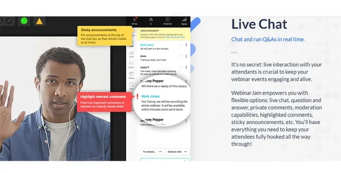 WebinarJam will spontaneously record your live broadcast in a video file. But itβs not just a simple recording. Webinar jam Replica Replay features mimics, second-by-second, everything that happens in the Live Room. It clocks every action happening in your Live Room so we can perfectly replicate them, second by second, in the Replay Room, as well as it is the best Webinar Recording Software.
