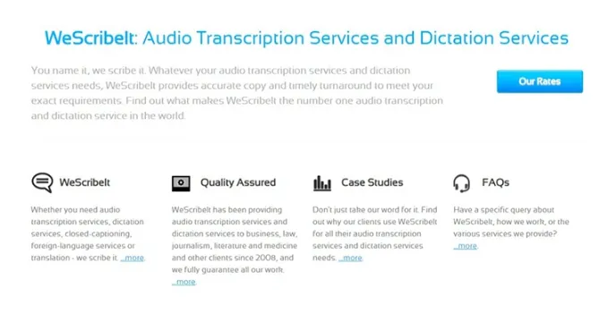 WeScribeIt has a company name now; we have consumers worldwide. Your prompt and competent service contribution is acknowledged, and the happy consumers who have used the service are positive evidence. Customers recommend new customers to this business service consistently and are frequent users. However, there is no detail on the quality assurance process of WeScribeIt available on its website. The user reports conducted on this page compliment the accurate and quick delivery of the transcripts.