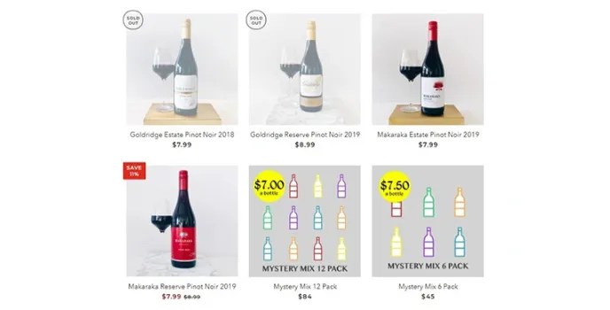 - Mystery mix packs of 6 and 12 Pinot Noir bottles.