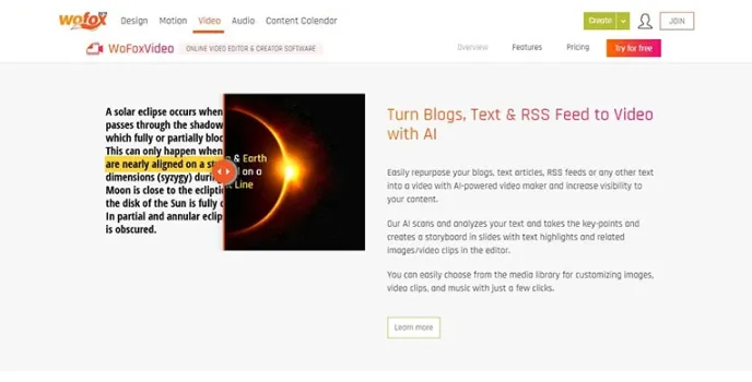 Videostudio and Lumen5 are two popular tools featuring title animations and customization effects similar to that of Wofox, favoring digital marketing. It is the best video editing tool with GIFs and motion graphics for creating spectacular visuals and the right platform for creating and editing content in one go to deliver stunning videos.