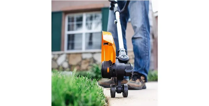 The product also comes with a pivoting head so that you can trim and edge on slopes and uneven terrains as well. The push-button rotating handle helps handle easy conversion from trimmer to edger. It also comes with accessory wheel storage for easy and more extended access. The variable speed throttle lets you ramp up the rpm's for stricter grass, and at the same time, you can decrease the speed to save the battery when the trimming is easy. This trimmer has the same grade lines that professional lawn care crew use on their trimmers, which leads to professional results. It includes a charger, spool, and a safety guard too.
