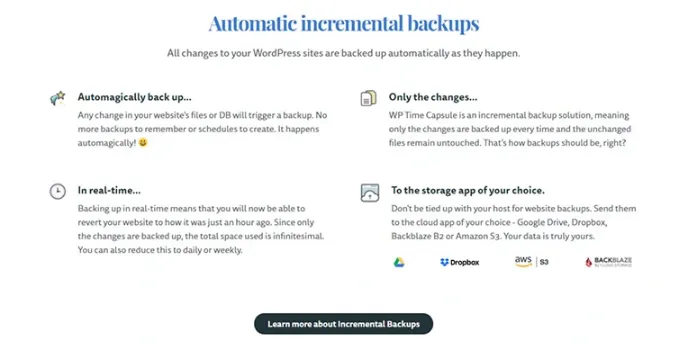 Everyone wants to backup only the changes in the website. One can find such an option here, WP Time Capsule is one of the best wordpress backup plugins that only backups the changes are done in the website and it doesnβt even touch the unchanged files. So that you use the backup and storage options efficiently.