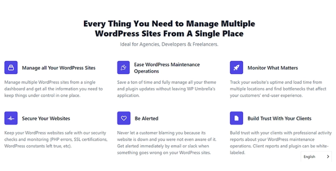 WP Umbrella is one of the best tools for managing multiple sites as it monitors the site all the time for security purposes. If it finds any issue regarding the malware, notifies it to the website owner. Monitors every single feature and option of the site and make the website owner correct the options for saving sites from hackers.