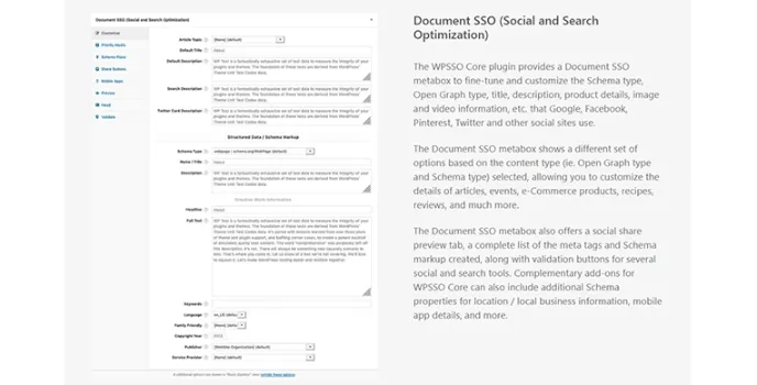 Document SSO meta box is offered by WPSSO Core. It helps to keep the content clear and customize the schema type, open graph type, title, description, products details, image, and many more on different social media platforms like Google, Facebook, Pinterest, Twitter, and other social sites that are mostly used. The meta box provides a social share preview tab, a complete list of meta tags, and schema markup created along with some other tools.