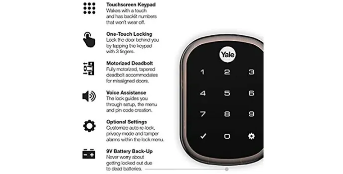 There is a wide range of features or aspects of the Yale Security Smart Door Lock. The touchscreen keypad works with a single touch, and numbers do not wear off.
