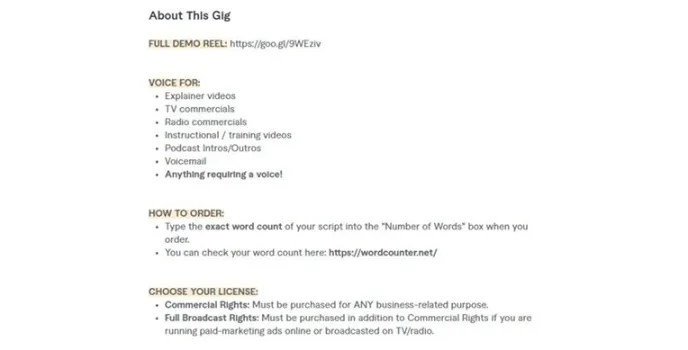 The Voice-Over Artist Service seller provides clients with fast turn-around time delivery giving them a radio and TV commercial type of voice-overs. One can quickly expect the delivery in one day. Several 150 words that provide voice are for explainer videos, TV, commercial, radio, commercials, instructional, and training videos for our interest and other Voice artists wherever it is suited. You can quickly start ordering by entering the exact word count in the word count box and check the word count from Google before writing your word count similar to best Content Marketing Services by Fiverr.