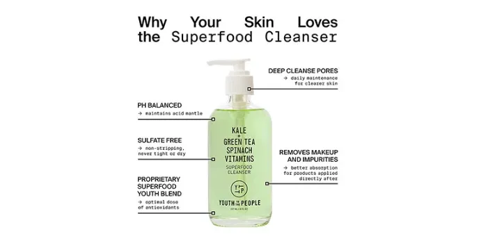 Due to calming and cleansing ingredients like chamomile and aloe leaf, it acts astringent, toner, and antioxidant cleanser suitable for acne-prone skin. Meanwhile, with sulfate-free and pH-balanced ingredients, this skincare product has a proprietary youth combination of superfoods with an antidote for deep cleansing the pores and removing makeup & dirt with comfort.